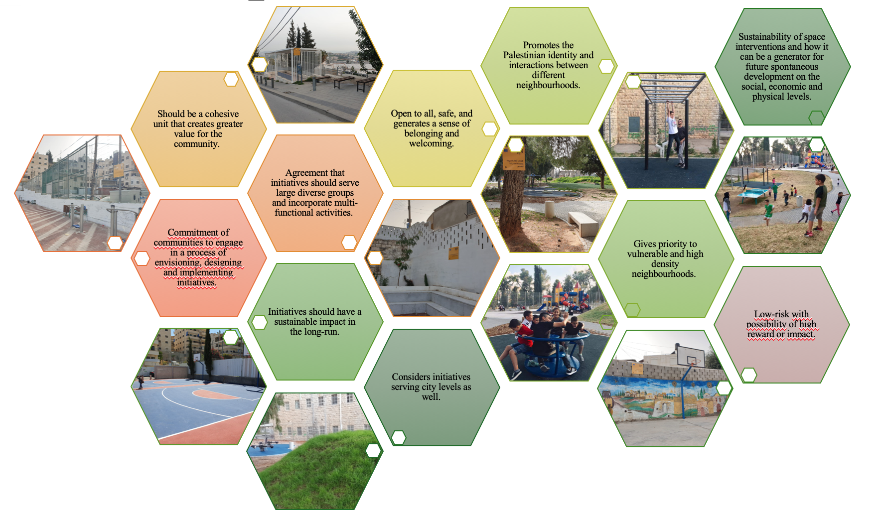 In subsequent years, the studios expanded to address larger-scale public spaces and community demands. Initiatives included parks, playgrounds, green amphitheaters, and multi-purpose recreational facilities in neighborhoods such as Beit Hanina, Sur Baher, Ras Al Amud, Al-Issawiyya and Jabal Al-Mukabber. The projects incorporated innovative elements like botanic gardens, outdoor learning spaces, and community gathering spaces. Design studios from 2017-2021 involved documenting methodologies through a toolkit and design manual, providing a model for placemaking and sustainable urban design in East Jerusalem. These outputs emphasize community participation, resilience, and creative solutions tailored to local needs.