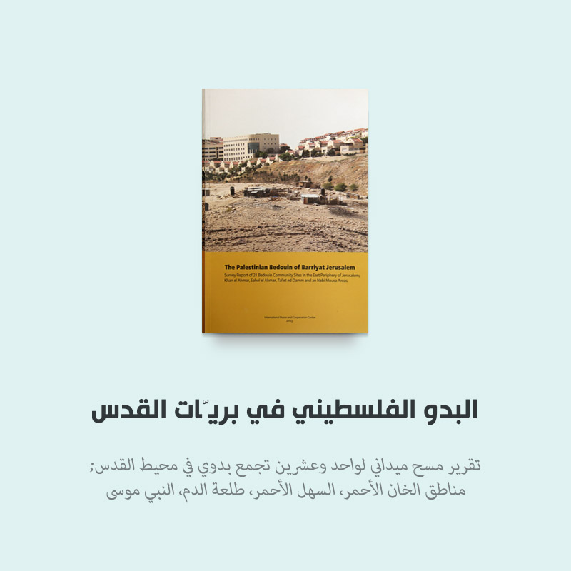 The planning survey for Bedouin communities in the Barriyat –outskirts- of Jerusalem was initiated in December 2011, and grew out of the efforts of the Displacement Working Group which supports Bedouin communities facing displacement. The project developed from a joint proposal put together by IPCC, UN Habitat and BIMKOM, with each organization examining related aspects and the needs of the communities, mainly focusing on protecting them from the threats of displacement. UN Habitat’s focus was on liaising with the Palestinian Authority and the Ministry of Planning to ensure feedback into the National Spatial Plan on planning policy for Bedouin communities. They highlighted the experience of neighbouring countries with regards to national planning guidelines for Bedouins, and considered environmental preservation and sustainability as part of the strategic plan for the future. BIMKOM studied the Arab Palestinian Bedouin communities (hereinafter referred to as Bedouin) that have been relocated to the al Jabal area. They also studied the environmental side effects of the adjacent municipal dump, and the symbiotic relationship between the Bedouin and their environment. IPCC contributed a detailed survey of all of the communities’ sites, examining their existing living conditions and access to services.